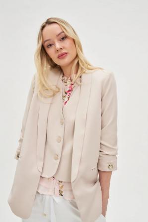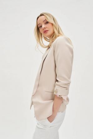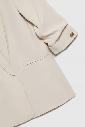 VNĚJŠÍ VRSTVA: 95% POLYESTER, 5% ELASTAN. PODŠÍVKA: 100% POLYESTER. Dámský blejzr, bez vzoru, ideální pro každodenní styling. Vyrobeno z hladkého polyesteru s podšívkou. Nařasené rukávy a 3/4 rukávy s manžetou dodávají eleganci. Praktické kapsy umožňují uložení drobností. Ideální pro každodenní i speciální příležitosti. Perfektní pro práci. Hodí se jak ke kalhotám, tak k sukni. Blejzr, který stojí za to mít ve svém šatníku.