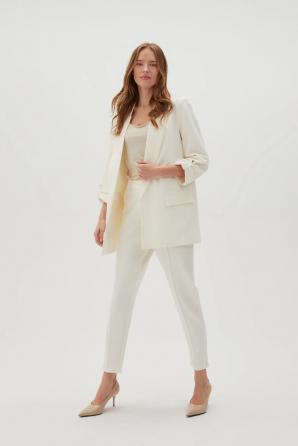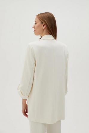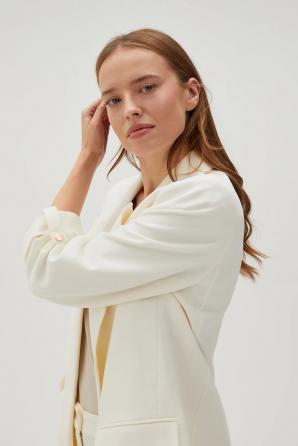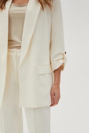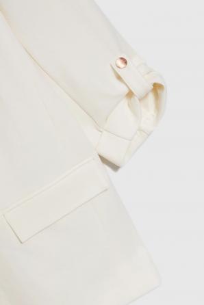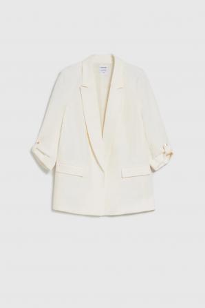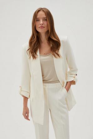 VNĚJŠÍ VRSTVA: 95% POLYESTER, 5% ELASTAN. PODŠÍVKA: 100% POLYESTER. Elegantní sako krémové barvy, bez vzoru, ideální pro každodenní nošení. Vyrobeno z hladkého polyesteru. Má délku tuniky a podšívku. Praktické kapsy a 3/4 rukávy s manžetami dodávají jedinečný charakter. Díky všestrannému designu je tato bunda ideální pro práci. Zkombinujte ji s bílou košilí a černými kalhotami pro elegantní vzhled nebo ji zkombinujte s džínami a teniskami pro ležérnější styl. Je to perfektní šatník pro ženy, které oceňují pohodlí a šik.