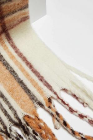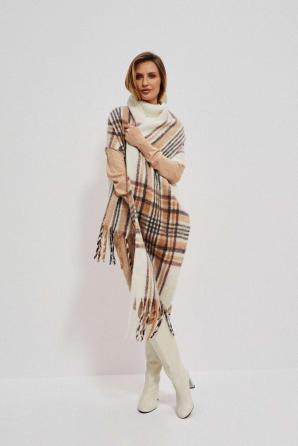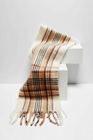 100% POLYESTER. Široký teplý šátek šitý v bílé barvě. Zdobené širokým hnědým a černým káro. Zakončeno tenkými dlouhými třásněmi. Neuvěřitelně měkké a příjemné na dotek. Dokonale ochrání před chladem a bude se hodit k mnoha stylům.