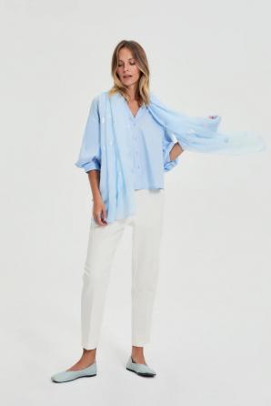 100% POLYESTER Tato světle modrá potištěná šála kombinuje lehkou látku s jemným, ženským stylem. Vzdušný materiál se decentně obepíná kolem krku a poskytuje pohodlí a módní vzhled bez ohledu na roční období. Hladká textura a výrazný potisk dělají z této šály jedinečný doplněk každodenního outfitu. Polyester zaručuje odolnost a snadnou údržbu, díky čemuž si šátek dlouho zachová svůj tvar a barvu. Tento styl je ideální do práce, na procházku nebo na schůzku ve městě. Jednoduše ji zkombinujte s klasickou košilí, volným svetrem nebo vaším oblíbeným sakem pro svěží a ženský vzhled.