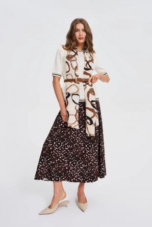 100% POLYESTER. Tato dámská šála v módním odstínu béžové přitahuje pozornost originální směsicí vzorů, které dodávají každému outfitu jedinečný charakter. Je vyrobena z měkkého polyesteru, je odolná, snadno se o ni pečuje a zachovává si svůj tvar po mnoho let. Je to perfektní volba pro setkání s přáteli, procházku městem nebo podzimní výlet. Perfektně se hodí k elegantnímu kabátu, klasické motorkářské bundě nebo svetru v neutrálních tónech. Je perfektním doplňkem k ležérním outfitům s džínami i k formálnějším pracovním outfitům.