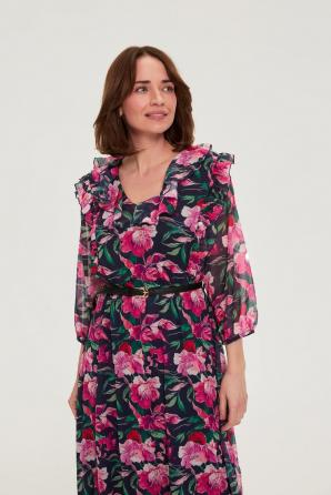 100% POLYESTER Tyto tmavě modré šaty s květinovým motivem kombinují ženský styl s každodenním pohodlím. Splývavá podšitá látka bez námahy splývá a zajišťuje volný pohyb po celý den. Jemné volánky a decentní řasení zdůrazňují pas, zatímco elastický pas a další pásek vám umožní přizpůsobit šaty vaší postavě. Výstřih do V opticky prodlužuje krk a dodává celému vzhledu svěží a moderní nádech. Tyto šaty jsou ideální do práce, na procházku nebo na neformální setkání s přáteli. Tyto ležérní šaty, ideální pro každodenní nošení, se stejně dobře hodí k klasickému saku a kotníkovým botám, jako k džínové bundě a teniskám. Roztažený lem a délka do poloviny lýtek zdůrazňují ženský styl, zatímco květinový vzor dodává každému outfitu nádech lehkosti. Ideální volba pro ty, kteří si ve svém šatníku cení pohodlí, stylu a všestrannosti.