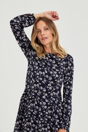 92% POLYESTER, 8% ELASTAN Tyto tmavě modré šaty s květinovým potiskem zaujmou svým decentním vzorem, který zdůrazňuje ženskost a přirozený styl. Měkká látka obepíná siluetu a lehce přiléhavý, rozšířený střih krásně splývá s pohybem a dodává každému kroku nádech lehkosti. Praktické kapsy a decentní řasení v pase kombinují pohodlí s módním nádechem, zatímco dlouhé rukávy s manžetami a kulatý výstřih vytvářejí harmonický celek, ideální pro aktivní dny. Materiál je měkký na dotek a umožňuje neomezený pohyb, což zajišťuje pohodlí od rána do večera. Šaty jsou ideální do práce, na procházku po městě nebo na neformální setkání s přáteli. V kombinaci s klasickými kotníkovými botami a krátkým kabátem vytvářejí stylový, ležérní vzhled, zatímco v kombinaci se sakem a podpatky získávají elegantnější charakter. Všestranný střih vám umožní cítit se pohodlně po celý den – bez ohledu na příležitost.