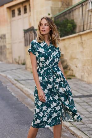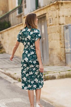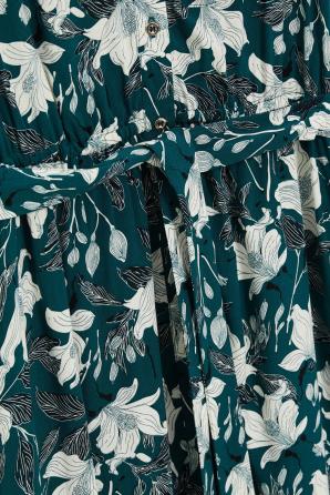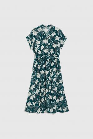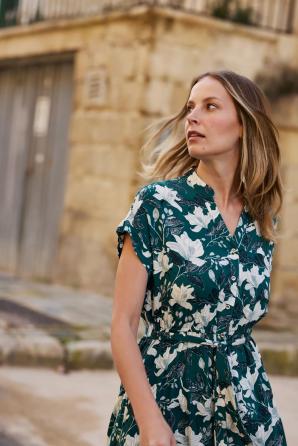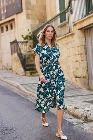 100% VISKÓZA Tyto zelené košilové šaty s botanickým potiskem jsou dokonalou kombinací pohodlí a ženského stylu. Jsou vyrobeny z měkké viskózy, jemně obepínají siluetu a zajišťují volnost pohybu po celý den. Jednoduchý, přiléhavý střih s elastickým pasem zdůrazňuje postavu, zatímco decentní řasení dodává nádech lehkosti. Praktické knoflíky po celé délce a kapsy zvyšují pohodlí. Klasický košilový střih s manžetami a výstřihem Henley činí z těchto šatů ideální volbu do práce, na procházku nebo na setkání s přáteli. Všestrannost šatů umožňuje řadu stylingových možností – v kombinaci s elegantním sakem a kotníkovými botami se hodí do kancelářského dress code, zatímco v kombinaci s džínovou bundou a teniskami se perfektně hodí pro neformální příležitosti. Tyto šaty v délce do lýtek s botanickým potiskem zdůrazňují módní, ženský styl a dodávají každému outfitu svěží nádech. Jsou praktickou nabídkou pro ženy, které si cení pohodlí, ženského střihu a nadčasového, stylového každodenního vzhledu.
