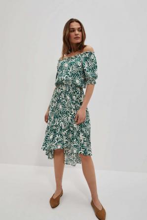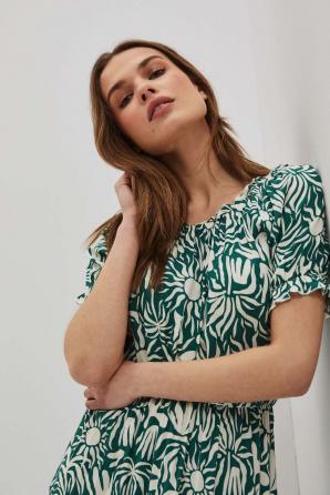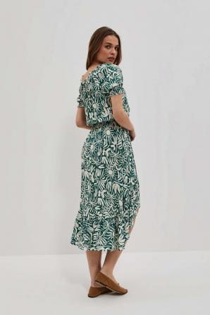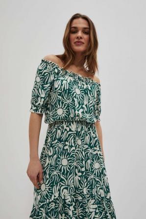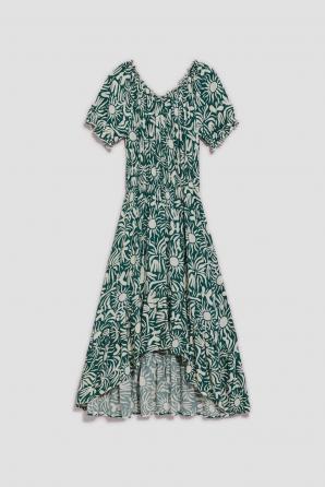 Okouzlující šaty v boho stylu, zelené barvy s jedinečným bílým potiskem. Španělský výstřih s pružnou vsadkou, který elegantně odhaluje ramena. Pružný pás zdůrazňuje pas a tvar postavy, zatímco jemné záhyby po celé délce šatů dodávají lehkost a šmrnc. Široký střih s roztomilými volány umožňuje pohodlný pohyb a nošení. Vyrobeno z lehké a prodyšné viskózy, ideální pro letní sezónu.