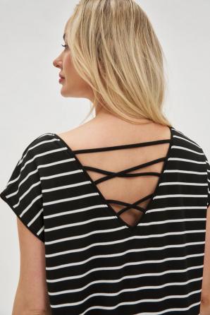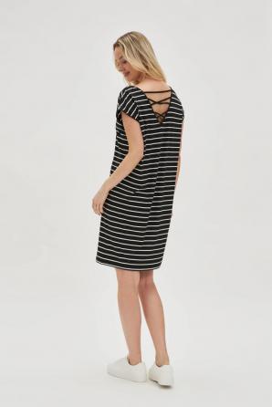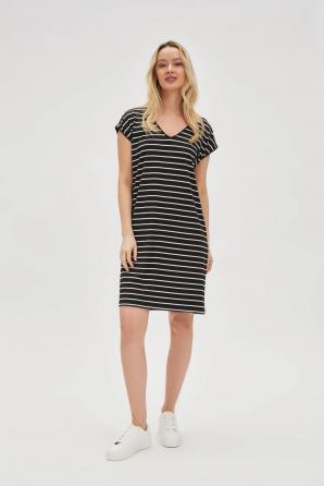 95% POLYESTER, 5% ELASTAN Jednoduché pletené šaty, které zaujmou kombinací klasické bílé a černé v módním, nadčasovém pruhovaném vzoru. Lehká, vzdušná bavlna zaručuje pohodlí, zatímco výstřih do V decentně zdůrazňuje krk. Otevřená záda dodávají stylu letní svěžest a ženské kouzlo. Délka ke kolenům dělá šaty pohodlnými a praktickými pro každodenní nošení. Perfektní volba pro každodenní nošení, do práce v ležérnějším stylu nebo na pláž v letních dnech. Skvěle se hodí k bílým teniskám, sandálům nebo espadrilkám. Perfektně se hodí k lehké džínové bundě, klasické nákupní tašce nebo tkané plážové tašce. Ležérní charakter šatů je vhodný jak pro městský styl, tak i na dovolenou.