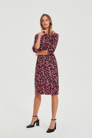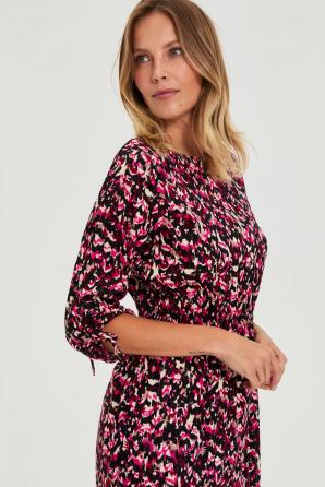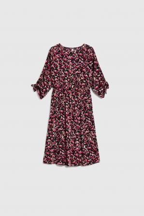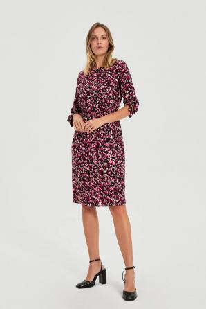 100% VISKÓZA. Tyto květinové šaty zaujmou intenzivní fuchsiovou barvou a ženským střihem. Jsou vyrobeny z měkké viskózy a okouzlují svou lehkostí a příjemným pocitem. Délka nad kolena s decentním zavazováním na 3/4 rukávech a elastickým pasem zdůrazňuje postavu a zajišťuje celodenní pohodlí. Jemný květinový vzor dodává šatům svěží nádech, zatímco praktická délka je vhodná pro mnoho příležitostí. Ideální pro den v kanceláři, odpolední procházku nebo setkání s přáteli. Pro ležérní vzhled je jednoduše zkombinujte s klasickými balerínkami nebo teniskami, pro elegantnější vzhled zvolte sandály a lehké sako. Tyto šaty jsou určeny ženám, které si cení pohodlí, ženského stylu a všestranných řešení pro každodenní nošení.