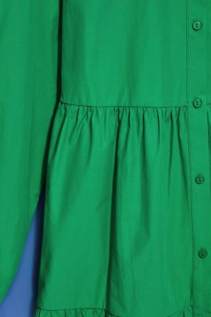 Střih od pasu, dole dva velké volány. Klasický límec pod krkem.