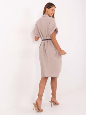 Tmavě béžové košilové šaty s krátkým rukávem a s páskem - UNIVERZÁLNÍ VELIKOST