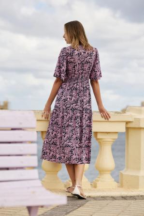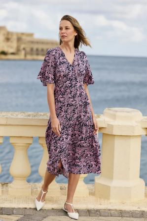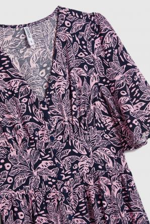 100% VISKÓZA. Tyto tmavě modré šaty s květinovým potiskem a motivem listů přitahují pozornost svou lehkostí a ženským střihem. Jemná viskóza zajišťuje volnost pohybu a pohodlné nošení po celý den. Přiléhavý střih s elastickým pasem zdůrazňuje siluetu, zatímco rozšířená sukně s volánky dodává lehký bohémský nádech. Volány a knoflíky vpředu dodávají jemný romantický nádech, zatímco výstřih do V opticky prodlužuje krk a dodává eleganci. Ideální do práce, na procházku po městě nebo na letní setkání s přáteli. Hodí se také jako stylové plážové šaty. Jednoduše je zkombinujte s lehkým sakem a klasickými sandály pro nadčasový a pohodlný každodenní vzhled. Pro uvolněný a ležérní vzhled je zkombinujte s džínovou bundou a espadrilkami. Šaty zdůrazní váš individuální styl a umožní vám cítit se žensky a pohodlně v každé situaci.