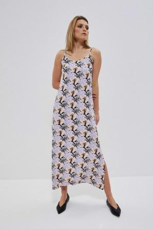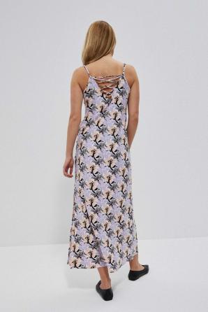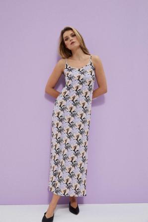 Dlouhé, úzké šaty s tenkými nastavitelnými ramínky. Potisk květin na celku. Vpředu kulatý výstřih, vzadu hluboký výstřih do V se šněrováním. Délka ke kotníkům. Rozparek na boku. Šaty s odhalenými rameny jsou perfektním řešením pro horké léto nejen na pláž, ale i na každodenní nošení.