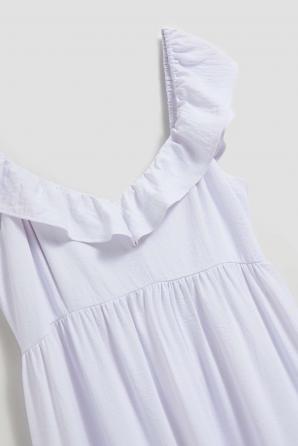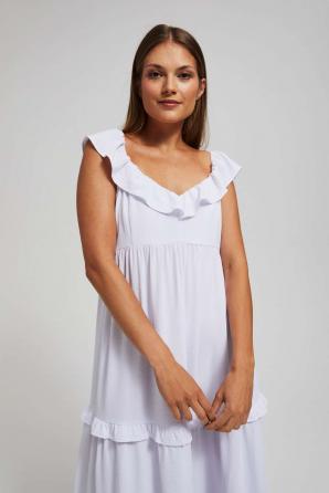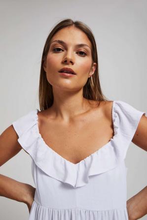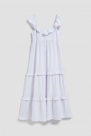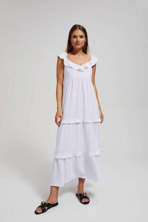 Jemné, vzdušné a romantické šaty ideální na rande. maxi délka. Vyrobeno v bílé barvě. Výstřih a krátké rukávy zdobené volánkem. Dvě řady volánů po celé délce, díky nimž šaty v pohybu krásně visí. Široký lem na zádech. Šaty zvýrazňují pas. Jedná se o zajímavou variantu oblečení pro ženy, které oceňují pohodlí a módní vzhled.