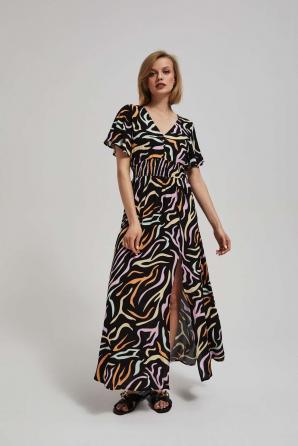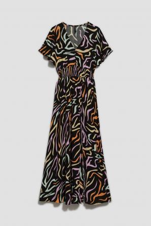 100% VISKÓZA Černé šaty zdobené geometrickými barevnými vzory po celé délce. Maxi délka, zajímavý hluboký rozparek na přední straně. Elastický pas zajišťuje pohodlí při nošení. Šaty pěkně zvýrazňují pas. Krátké, volné rukávy. Hluboký výstřih do V zakončený svislou řadou malých knoflíků. Ideální pro práci a setkání s přáteli. V tomto modelu budete vypadat skvěle a cítit se skvěle.