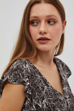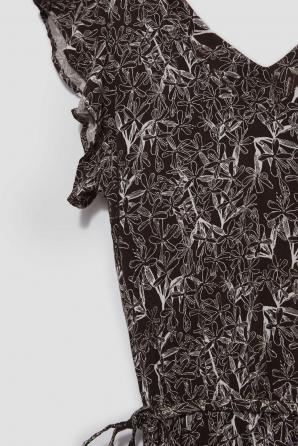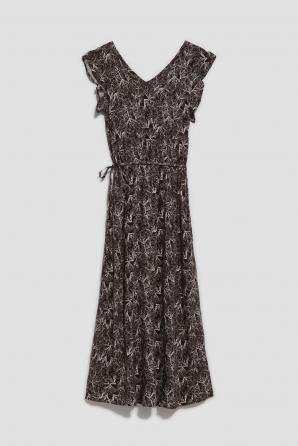 100% VISKÓZA Tmavě hnědé šaty v boho stylu. Všude jemný květinový vzor. Výstřih do V jemně odhalující krk. Krátké a široké rukávy s volánky. V pase všitá gumička umožňuje šaty upravit a přizpůsobit postavě a pásek pas dokonale zvýrazní. Velmi ženský střih, směrem dolů se rozšiřující, dodává eleganci a zajišťuje volnost pohybu. Délka ke kotníkům. Vyrobeno z viskózy, je měkké a jemné na dotek a zároveň vzdušné. Šaty se hodí na mnoho příležitostí i do práce.