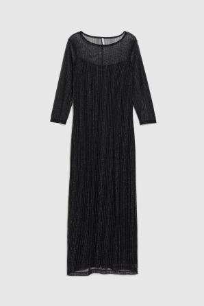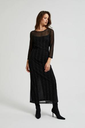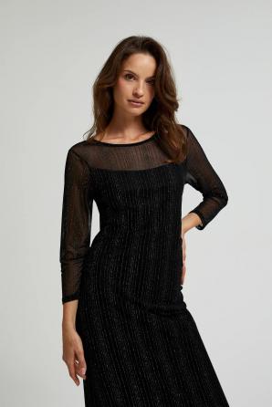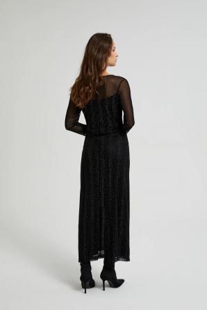 Černé šaty se stříbrnými pruhy jsou perfektní volbou pro zvláštní příležitost. Vyrobeno z průhledné látky zdobené krajkou, která dodává eleganci a jemnost. Svítící vlákno mu dodává jemný lesk. Šaty jsou vypasované, vypasované a rovné, sahající až ke kotníkům, což zvýrazňuje ženskou siluetu. Má kulatý výstřih a podšívku, zajišťující pohodlí a komfort nošení. Pletené šaty jsou ideální na večerní výlety, večírky nebo oslavy. Skvěle se hodí ke klasickým vysokým podpatkům a jemným šperkům. Díky minimalistickému designu ji lze kombinovat se sakem a podpatky na elegantní akce nebo s kotníkovými botami a džínovou bundou na neformálnější schůzky. Ideální pro mnoho příležitostí!