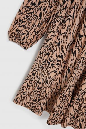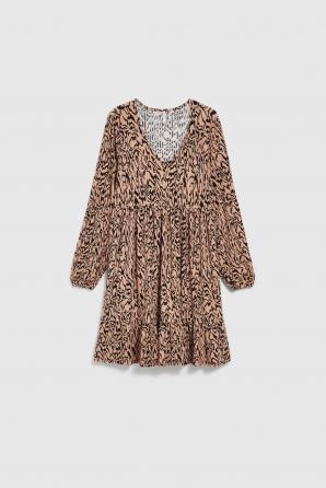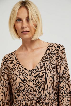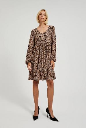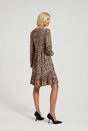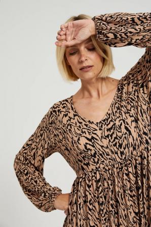 Dámské šaty z kvalitního polyesteru v béžové a černé barvě se zvířecím potiskem. Tento model se vyznačuje efektními volány, volánem a výstřihem do V, který mu dodává eleganci a jedinečný šarm. Jedná se o rozšířené šaty, ideální pro každodenní nošení, do práce a speciální příležitosti. Díky svému klasickému střihu se skvěle hodí na různé akce. Šaty se perfektně hodí do ležérního stylu a jejich univerzální charakter vám umožní vytvořit mnoho různých outfitů. Lze ji kombinovat s kotníčkovými botami na vysokém podpatku, teniskami nebo balerínkami. Skvěle se hodí ke klasickým doplňkům, jako jsou jemné šperky nebo elegantní kabelka. Je perfektní volbou pro mnoho příležitostí, jak pro každodenní, tak pro formálnější setkání.