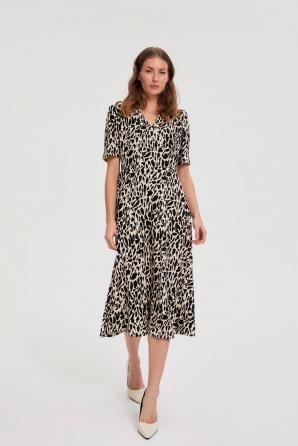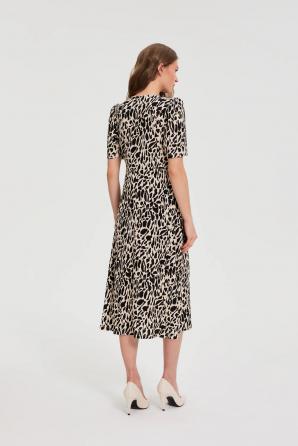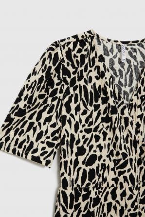 93% POLYESTER, 7% ELASTAN Tyto krémové, ecru šaty s módním zvířecím potiskem zaujmou svým ženským střihem a lehkým materiálem. Látka zajišťuje pohodlí, zatímco jemně splývavé nabrané rukávy dodávají siluetě nádech jemnosti. Asymetrický, zavinovací výstřih do V zdůrazňuje krk, zatímco přiléhavá, rozšířená silueta krásně tvaruje postavu a umožňuje vám cítit se pohodlně po celý den. Délka šatů do poloviny lýtek odpovídá aktuálním trendům a zároveň zůstávají praktickým kouskem šatníku. Tento střih je ideální do práce, na každodenní aktivity i na večerní vycházku s přáteli. Šaty se perfektně hodí ke klasickému saku a kotníkovým botám, nebo k džínové bundě a teniskám pro ležérnější vzhled. Jsou to volby pro ženy, které si cení stylu, pohodlí a všestrannosti, rády si hrají s módou a hledají šaty, které podtrhnou jejich osobnost bez ohledu na příležitost.