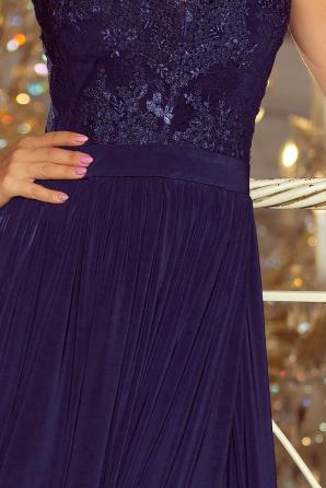 Dlouhé maxi šaty s vyšívaným výstřihem v pastelově modré barvě. Šaty krásně odkrývají výstřih a záda. Zapíná se na zadní straně knoflíkem a krytem na zip.