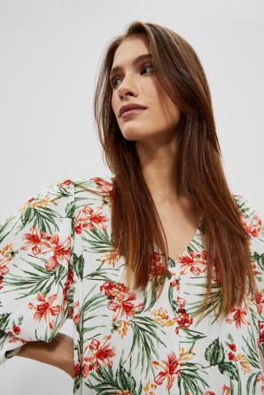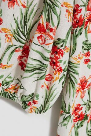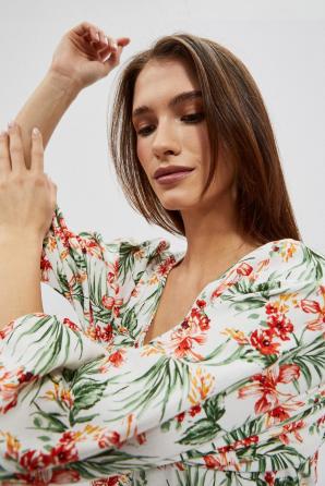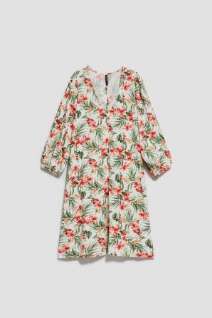 Bílé šaty s květinovou lehkostí: Objevte kouzlo těchto vzdušných, rozevlátých bílých šatů, které vás zahalí do nádhery květinových motivů a romantických květin. Uvolněný střih a 3/4 nafouklé rukávy s gumičkou na konci zaručují pohodlí a eleganci. Boho styl těchto šatů dodává rozevlátou a vzdušnou atmosféru, zatímco délka těsně nad koleny a výstřih ve tvaru V přidávají ženskost. Tyto mimořádně pohodlné šaty perfektně padnou a díky svému ležérnímu, univerzálnímu střihu jsou ideální jak pro každodenní nošení, tak pro chvíle v práci.