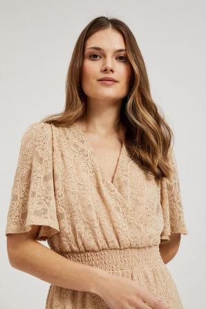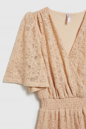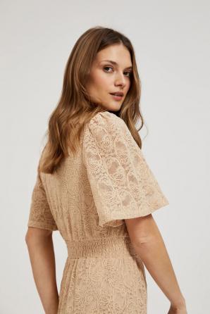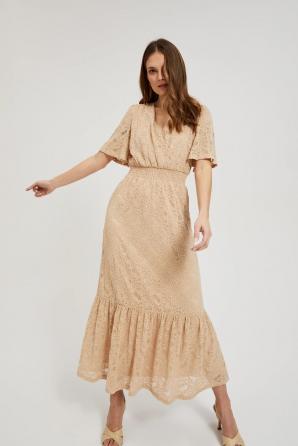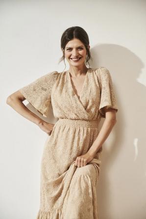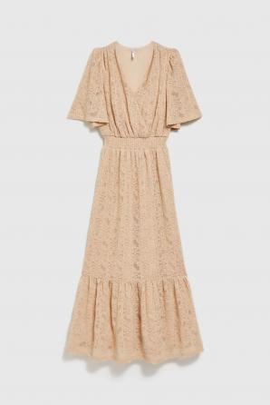 MATERIÁL 1: 90% POLYAMID, 10% ELASTAN, MATERIÁL 2: 100% POLYESTER Elegantní béžové šaty s jemnou krajkou a květinovým vzorem. Vyrobeno z vysoce kvalitních materiálů, zajišťujících pohodlí při nošení. Šaty mají rozšířené rukávy, volány a pružný pas, díky čemuž perfektně padnou na postavu. Navíc je vybavena podšívkou, díky které se pohodlně nosí. Ideální jak pro zvláštní příležitost, tak pro každý den. Díky svému klasickému designu budou šaty perfektní jako součást šatníku pro mnoho různých příležitostí. Lze jej kombinovat jak s elegantními vysokými podpatky, tak s ležérními sandály. Bude vypadat perfektně jak na pláži, tak na letních setkáních. Šaty s výstřihem do V a trapézový tvar do poloviny lýtek zvýrazní každou postavu a dodají jí trochu půvabu a elegance.