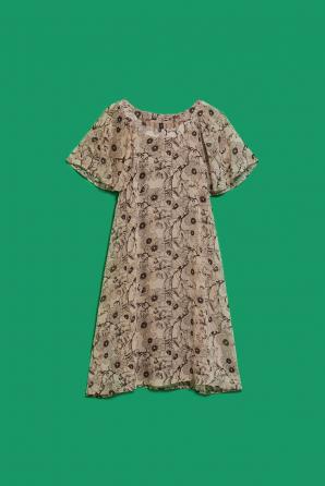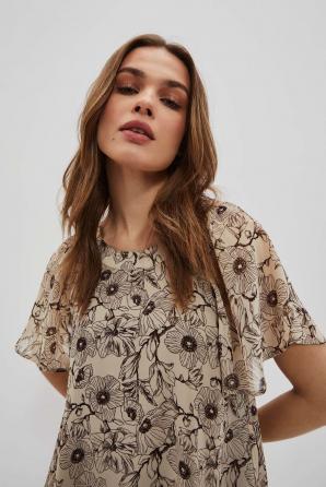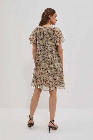 100% POLYESTER Dámské šaty béžové barvy. Po celé délce jemný květinový potisk. Kulatý výstřih. Krátké jemné rukávy z průhledného materiálu. Uvnitř podšívka. Lichoběžníkový střih, směrem dolů rozšířený. Vzadu ve výšce lopatek je materiál lehce nařasený. Délka nad kolena, spodní část mírně zaoblená. Vyrobeno z lehkého a vzdušného materiálu. Pohodlné a neomezují v pohybu Perfektní pro každodenní použití, práci a speciální příležitosti. Musíte to mít!