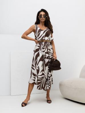 Hnědé letní šaty s rostlinným motivem, UNIVERZÁLNÍ VELIKOST, bez rukávů s výstřihem do V