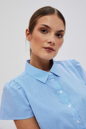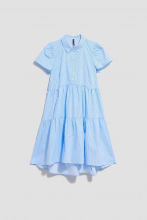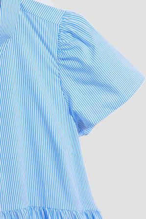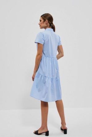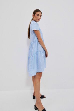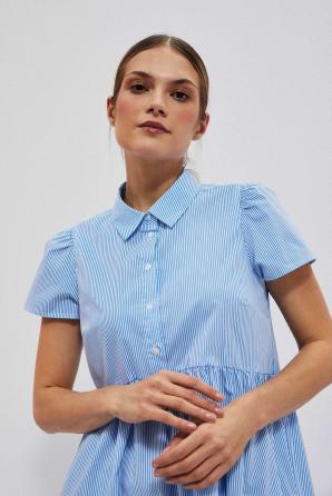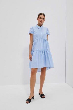 Košilové šaty s vlnitým vzorem. Celek zdobí jemné, úzké, svislé pruhy v bílé a modré barvě. Krátké rukávy s jemnými obláčky. Zapínání nahoře na malé knoflíky. Od pasu dolů jsou dvě řady volánů, díky kterým jsou šaty pěkně uspořádané do písmene A. Vysoký výstřih s klasickým stahovacím límečkem. Délka nad kolena. Hladké, bez vzoru. Volný, rozšířený, nadčasový střih zajišťuje pohodlí a svobodu pohybu. Model volného rozevlátého střihu šikovně skryje případné nedostatky postavy. Tyto kalhoty jsou perfektní volbou pro kancelářský styl i pro venčení s přáteli.