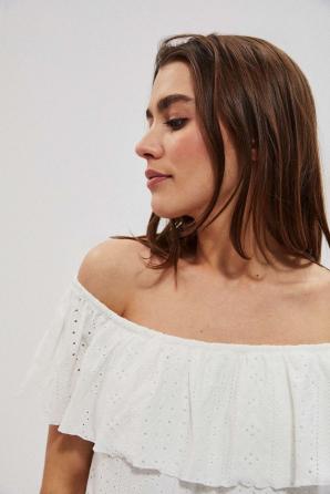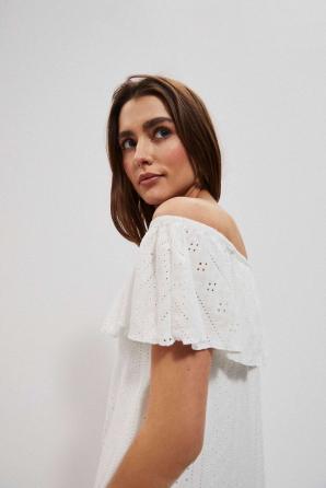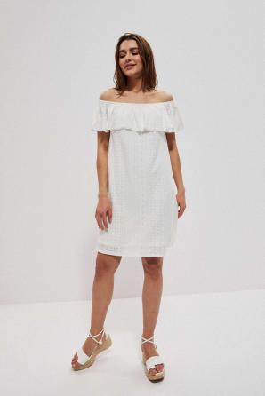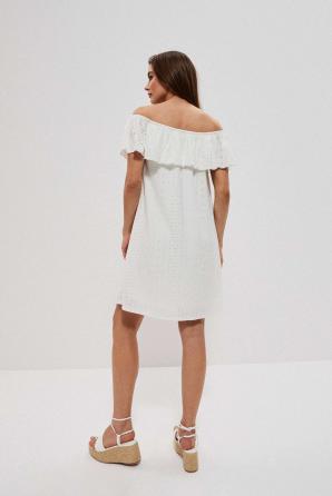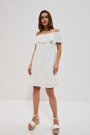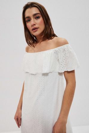 Bílé španělské šaty s odhalenými rameny. Vyšívaná látka s romantickým, perforovaným vzorem. Podšívka vespod. Pružný lodičkový výstřih s gumičkou a možností stažení přes ramena. Dekolt je zakončen ozdobným volánkem. Lichoběžníkový řez. Délka nad kolena. Velmi ženské šaty na každý den na pláž.