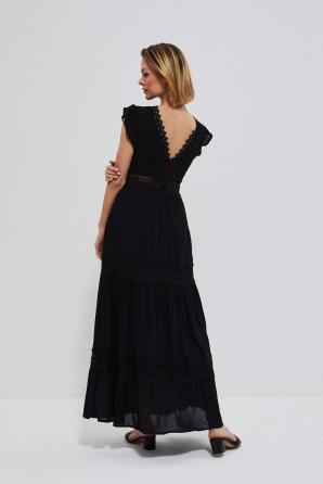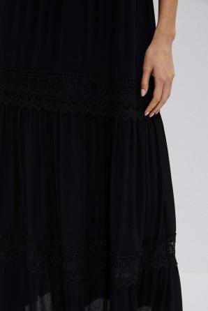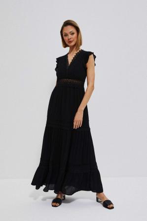 Dlouhé šaty s výstřihem do V vpředu i vzadu. Příjemný viskózový materiál. Tři řady nařasených volánů oddělených krajkovými proužky. Zapínání na zip uprostřed zad. Krásné motýlí rukávy. Délka maxi, délka ke kotníkům. Smyslná krajka dodává celku boho atmosféru. Tento model na letní oslavy musíte mít.