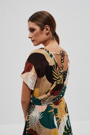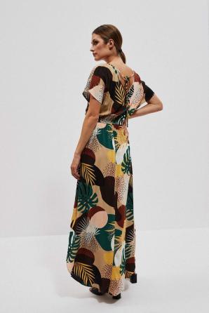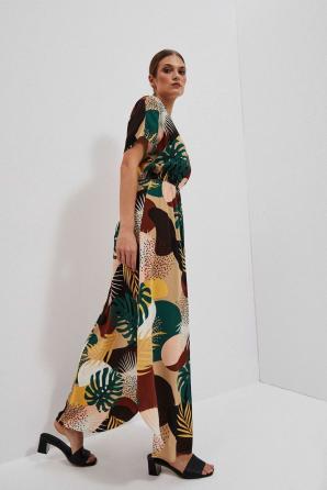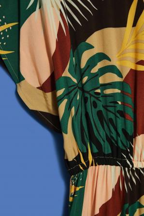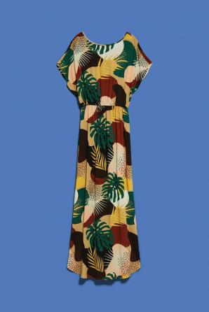 Objete svět exotických barev a vzorů v těchto maxi šatech s přírodním tropickým motivem. Zaoblený výstřih elegantně odhaluje klíční kosti, zatímco zadní výstřih s jemnou šňůrkou odkrývá záda, což dodává šatům jiskru tajemství.