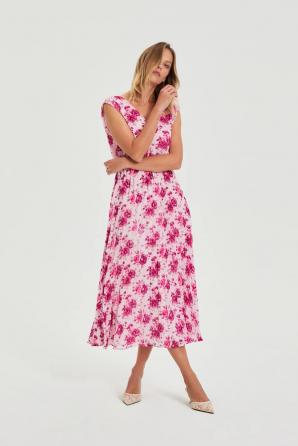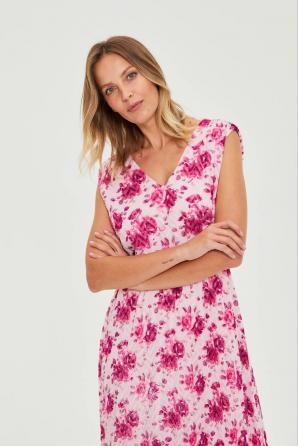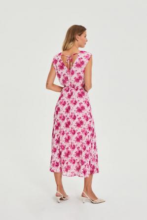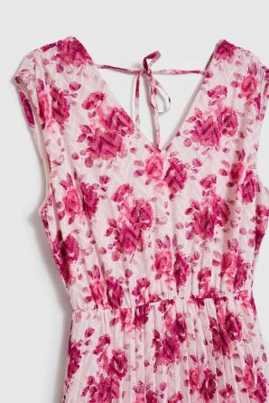 100% POLYESTER Tyto midi šaty zaujmou svým decentním květinovým potiskem v odstínech růžové a ženským střihem. Vzdušná šifonová tkanina s lehkou podšívkou zaručuje celodenní pohodlí, zatímco elastický pas a jemné plizování dodává šatům nádech lehkosti, zatímco hluboký výstřih do V a zavazování na zádech a ramenou vytvářejí fascinující a okouzlující akcent. Rozevlátý střih umožňuje šatům krásně splývat s pohybem a zajišťuje jim lehkost a pohodlí. Šaty jsou ideální pro zvláštní příležitosti – od svatby přes romantickou večeři až po letní zahradní párty. Pro elegantní vzhled je jednoduše zkombinujte s klasickými sandály na podpatku a jemnými šperky. Pro každodenní nošení vypadají skvěle s džínovou bundou nebo lehkým kardiganem a plochými botami. Šaty odrážejí ležérní a ženský styl a kombinují funkčnost s módním charakterem. Perfektní volba pro aktivní ženu, která si cení pohodlí a jedinečného, ??svěžího vzhledu.