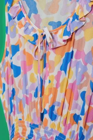 100% VISKÓZA Originální dámské šaty na široká ramínka. Vyrobeno v boho stylu. Na bílém podkladu, zdobený zajímavým barevným vzorem. Je vyrobena z kvalitní viskózy, která zajišťuje komfort nošení i po celý den. Délka do půli lýtek. V pase je elastická guma, která perfektně sedí na postavě. Šaty jsou zakončeny ozdobným volánem. Rozšířený střih. Kulatý výstřih s volánky a zavazováním. Tyto šaty jsou skvělou volbou pro ženy, které oceňují pohodlí, styl a eleganci v jednom.