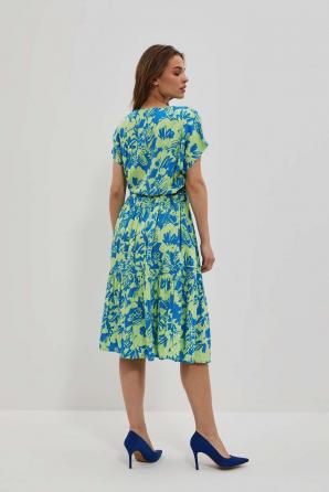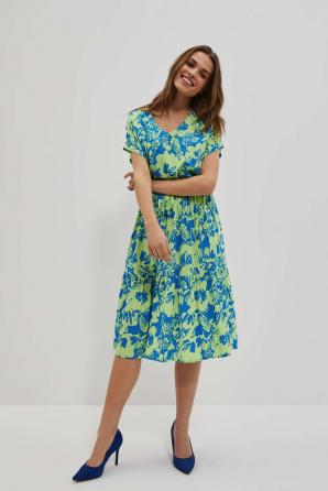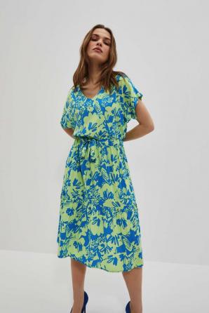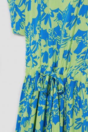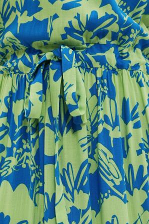 100% VISKÓZOVÉ Dámské šaty v modré a zelené barvě. Po celém květinovém vzoru. Ženský výstřih do V. Krátké a volné rukávy, na okrajích jemně vyhrnuté. Volný horní díl. V pase guma a šňůrka na zavazování. Volný spodní díl šatů s nařaseným materiálem a tvořící volán. Midi délka. Vyrobeno z materiálu příjemného na dotek, který neomezuje v pohybu při chůzi. Skvěle se bude hodit pro zvláštní příležitosti a každodenní výlety, například do práce.