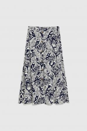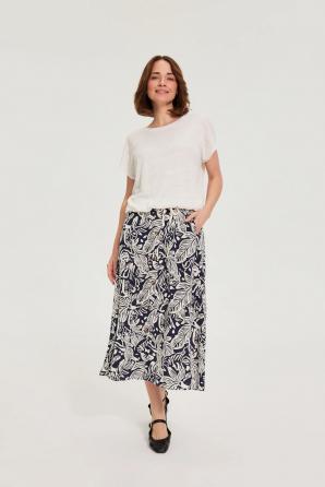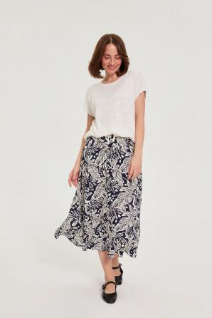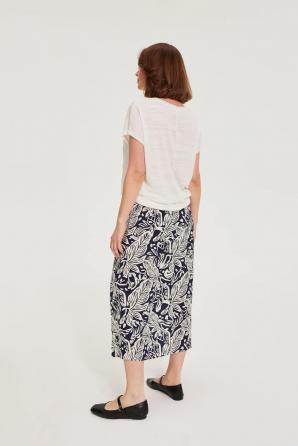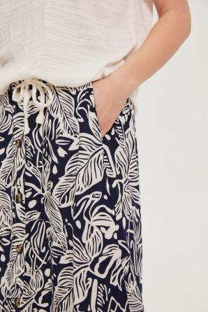 100% VISKÓZA. Tato midi sukně s rostlinným potiskem je kombinací pohodlí a stylu, ideální pro každodenní nošení. Vzdušná, lehká viskóza je příjemně hebká na dotek, zatímco elastický pas zajišťuje celodenní pohodlí. Vysoký pas lichotí postavě, ozdobné knoflíky dodávají sukni charakter a praktické kapsy dělají sukni módní i funkční zároveň. Roztažený střih krásně splývá s pohybem a dodává jí uvolněný a ženský vzhled. Sukně je ideální pro pracovní schůzky, víkendové procházky nebo večerní setkání s přáteli. Krásně se hodí k obyčejnému tričku, klasické košili nebo lehkému saku. V kombinaci s teniskami získá ležérní nádech a s elegantními sandály romantickější nádech. Všestranný střih a módní potisk dělají ze sukně všestranný základ pro mnoho stylů a příležitostí.