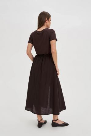 85% BAVLNA, 15% LEN. Tato hnědá sukně s hladkým povrchem je perfektní volbou pro ženy, které si cení pohodlí a všestranného stylu. Lichoběžníkový střih umožňuje volný pohyb, zatímco délka do poloviny lýtek decentně zdůrazňuje siluetu. Elastický pas zajišťuje perfektní střih a celodenní pohodlí. Praktické kapsy dodávají funkčnost. Dominantním materiálem je měkká, prodyšná bavlna, která zajišťuje pohodlné nošení i v těch nejnáročnějších dnech. Ideální pro každodenní nošení, do práce, na schůzky s přáteli, ale i na procházky po městě. Krásně se hodí ke klasické košili, svetru, jednoduchému topu nebo přiléhavému saku. Hodí se ke kotníkovým botám, teniskám nebo balerínkám a vytváří tak vždy módní a ženský vzhled.