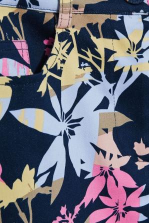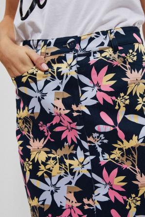Dámská tužková sukně. Vyrobeno v námořnické modré s krásným potiskem. Celkově zdobené barevnými květinami. Elegantní, vypasovaný v délce nad kolena, zvýrazňuje přednosti ženské postavy a pěkně odhaluje nohy. Zapínání na ozdobný knoflík a zip. V pase poutka na pásek, díky kterým můžete sukni nosit s páskem. Dvě kapsy na přední straně a na bocích. Ideální pro kombinace s elegantními halenkami. Ideální pro každodenní práci.