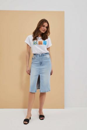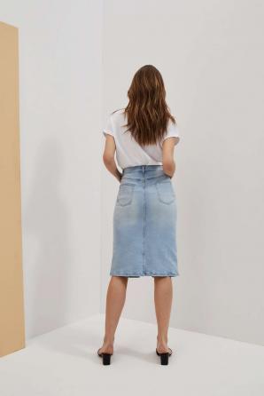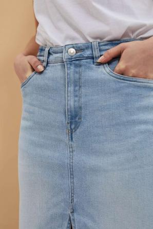 Velmi módní džínová sukně této sezóny. Ve světle modré barvě. Hladké, bez vzoru nebo oděrek, průměrný pas. Zapínání na knoflík a zip. Pantofle v pase. Dvě skládací kapsy na přední a zadní straně. Tužkový střih, zdůrazňující postavu. Prodloužená délka ke kolenům. Rozparek uprostřed materiálu, vytvářející rozparek. Vyrobeno z bavlny s přídavkem elastických materiálů. Perfektně sedí a zvýrazňuje siluetu. Perfektní pro letní stylizace, světlé košile a letní boty. Perfektní na každý den i do práce.