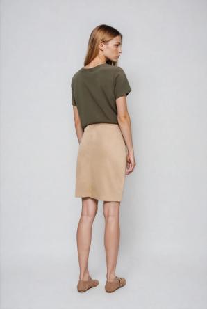 95% POLYESTER, 5% ELASTAN Tato béžová sukně je ztělesněním pohodlí a ženského stylu ve vašem každodenním šatníku. Módní střih po kolena decentně zdůrazní vaši postavu, zatímco elastický pas zajišťuje volnost pohybu po celý den. Hladká a měkká látka vás zahalí do lehkého a pohodlného pocitu, díky kterému se budete cítit pohodlně a přirozeně v každé situaci. Neutrální odstín béžové se dokonale hodí k vašim oblíbeným doplňkům a vytvoří základ pro mnoho inspirativních outfitů. Tato sukně je ideální do kanceláře, na procházky po městě nebo na víkendové pobyty s přáteli. V kombinaci s klasickou košilí a sakem získá elegantní nádech a v kombinaci s jednoduchým tričkem nebo jemným svetrem se skvěle hodí pro každodenní nošení.