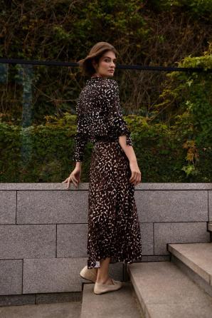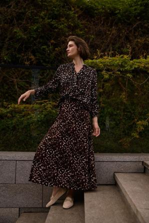 100% VISKÓZA Tato rozšířená maxi sukně v hnědých odstínech se pyšní výrazným zvířecím potiskem. Elastický pas zajišťuje pohodlí, přizpůsobí se postavě a zaručí celodenní nošení. Lehká tkanina s převahou přírodní viskózy příjemně obepíná pokožku a umožňuje jí dýchat. Sukně po kotníky se s každým pohybem jemně pohupuje a vytváří pocit lehkosti a pohodlí. Tento střih je ideální na letní procházky, setkání s přáteli nebo romantické večeře. Perfektně se hodí k přiléhavému topu, lněné košili nebo lehkému svetru a sandálem nebo espadrilkám.