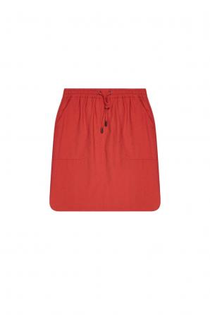 Perfektní sukně na léto! Délka nad kolena. V pase guma a šňůrky pro úpravu obvodu. Krásná červená barva. Příjemný, viskózový materiál, hladký, bez vzoru. Přední skluzové kapsy. Svislé prošívání vzadu. Po stranách malé rozparky.