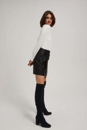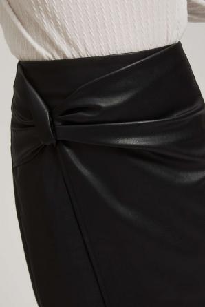 Bezvzorová sukně v černé barvě je perfektní volbou pro každou ženu, která si cení jednoduchosti a elegance. Vyrobeno z vysoce kvalitního polyesteru, hladkého na dotek a extrémně odolného. Díky svému neobvyklému designu je jedinečná a odlišuje se od ostatních sukní. Volány na boku mu dodávají jedinečný charakter a ekokůže zase trochu rockového stylu. Jeho lichoběžníkový tvar a asymetrické zakončení zdůrazňují ženskou postavu a dodávají sebevědomí. Sukně sahá do půli stehen, takže je ideální pro mnoho různých příležitostí. Dá se nosit jak na elegantní příležitosti, tak na každodenní setkání s přáteli. Hodí se jak k elegantní košili, tak k volné halence a vytváří nevšední kombinaci. Díky zipu vzadu se snadno obléká i svléká. Tato sukně nesmí chybět v šatníku každé módní ženy!