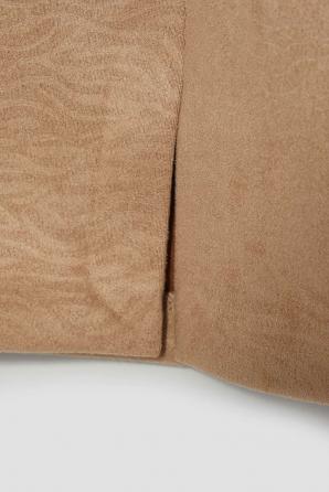 Jednoduchá minisukně z materiálu imitace semiše. V pase guma. Na jedné straně je vpředu malý rozparek. Barva béžová.