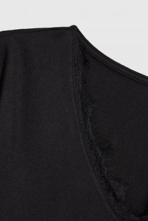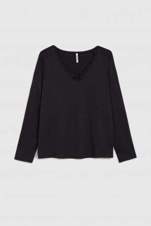 95% POLYESTER, 5% ELASTAN Tento černý dámský svetr s klasickým střihem zaujme svou decentní elegancí a všestranným stylem. Hladká, nevzorovaná textura zdůrazňuje jeho nadčasový charakter, zatímco jemná krajka mu dodává výjimečné kouzlo a ženskou eleganci. Dlouhý rukáv s výstřihem do V zeštíhluje postavu a krásně zvýrazňuje krk. Je to perfektní volba pro mnoho příležitostí – od každodenních výletů, přes schůzky s přáteli až po romantickou večeři. Perfektně se hodí ke klasickým džínům, elegantní midi sukni nebo látkovým cigaretovým kalhotám. Je perfektním doplňkem jak k kancelářským, tak i k ležérním outfitům, zdůrazňuje individuální styl a dodává každému šatníku nádech jemnosti.