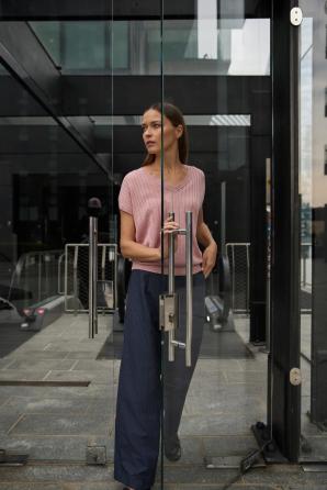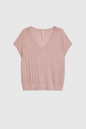 80% VISKÓZA, 20% METALICKÁ NIT. Tento svetr s krátkým rukávem, vyrobený z viskózy v jemném odstínu růžové, zaujme svou lehkostí a ženským charakterem. Žebrovaný úplet s jemnou metalickou nití dodává nádech decentního třpytu a zdůrazňuje váš individuální styl. Volný střih se spuštěnými rameny a výstřihem do V vytváří pohodlnou, uvolněnou siluetu a umožňuje volnost pohybu po celý den. Měkká, příjemná látka na dotek promění každodenní styling v potěšení. Ideální volba do práce, na kávu s kamarádkou nebo na večerní procházku městem. Svetr se krásně hodí k elegantním kalhotám, klasické sukni, volným džínům nebo pod sako. Strukturovaný vzor a růžová barva vnesou do vašeho šatníku svěžest a spojují ležérní pohodlí s ženskou elegancí.