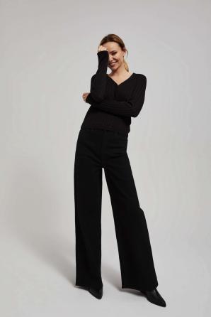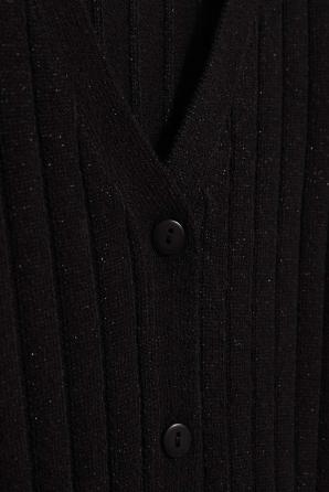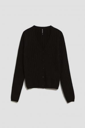 Tento svetr je rozepínací, což umožňuje jeho nošení na mnoho různých způsobů. Doplňkovým dekorativním prvkem jsou metalické nitě, které se jemně prolínají s černým materiálem a dodávají mu elegantní a moderní vzhled. Knoflíky umístěné na přední straně svetru mu dodávají jedinečné kouzlo a umožňují libovolně nastavit hloubku výstřihu. Dlouhé rukávy poskytují ochranu před chladem a výstřih do V dodává celé věci nadčasový charakter.