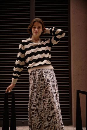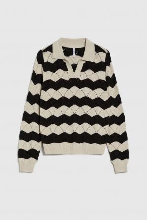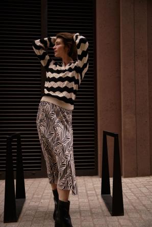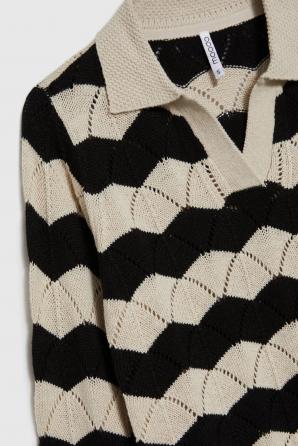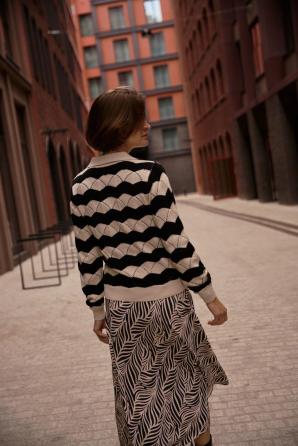 60% BAVLNA, 40% AKRYL Tento klasický dámský svetr v béžové barvě s černými pruhy je ideální pro milovnice nadčasové elegance a pohodlí. Jeho hladká textura a absence dalších vzorů činí z tohoto kousku perfektní volbu pro nejnovější trendy. Dlouhé rukávy a decentní límec dodávají svetru nádech elegance, zatímco přírodní bavlna zajišťuje pohodlí a prodyšnost i během náročného dne. Je ideální volbou pro obchodní schůzky, rodinné oslavy nebo každodenní práci. Krásně se hodí jak k cigaretovým kalhotám, tak k klasické pouzdrové sukni. Hodí se také k džínům a mokasínům pro ležérní vzhled.
