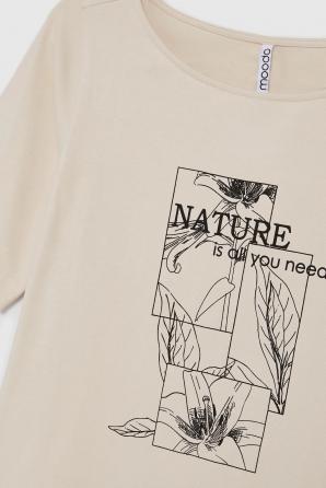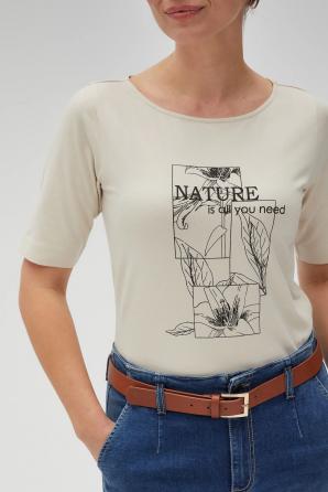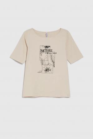 95% BAVLNA, 5% ELASTAN Béžová halenka z měkké bavlny. Na přední straně má potisk. Krátké rukávy a vypasovaný střih dokonale zdůrazňují siluetu. Lodkový výstřih dodává na eleganci a dělá halenku extrémně ženskou. Tato halenka bude ideální pro večerní výlety, setkání s přáteli nebo rande. Skvěle bude vypadat k džínům, sukni i elegantním kalhotám. Díky svému univerzálnímu designu se dá nosit při mnoha různých příležitostech.