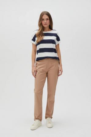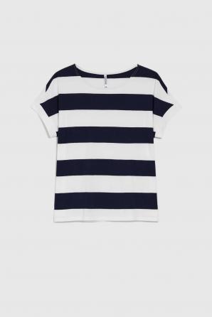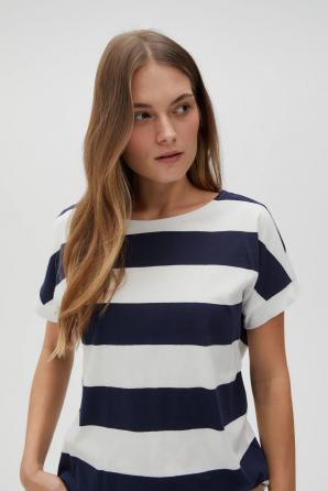 100% BAVLNA Pruhovaná halenka v bílé a tmavě modré barvě. Vyrobeno z měkké bavlny, zajišťující pohodlí při nošení. Model s krátkými rukávy s manžetami má volný střih, který zdůrazňuje volnost pohybu. Ideální pro letní dny. Skvěle se hodí k džínům, šortkám nebo tužkové sukni.