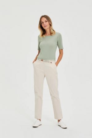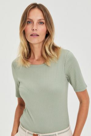 95% BAVLNA, 5% ELASTAN Tato žebrovaná halenka v olivově zelené barvě zaujme svou jednoduchostí a decentní elegancí. Přiléhavý střih krásně zdůrazňuje siluetu, zatímco krátké rukávy a kulatý výstřih dodávají nádech lehkosti a ženskosti. Měkká tkanina s přídavkem přírodních vláken zajišťuje celodenní pohodlí a vytváří všestranný základ pro různé outfity. Hladký, nevzorovaný povrch dělá z této halenky všestranný základní kousek šatníku, který snadno doplní moderní městský styl. Je ideální jak do kanceláře, tak pro každodenní výlety či schůzky s přáteli. Vypadá krásně v kombinaci s klasickými džínami, elegantní sukní nebo pod sakem a vytváří stylový look pro každou příležitost. Tato olivově zelená halenka s krátkým rukávem v sobě spojuje pohodlí, ženské kouzlo a módní minimalismus a inspiruje k vytváření jedinečných každodenních outfitů.