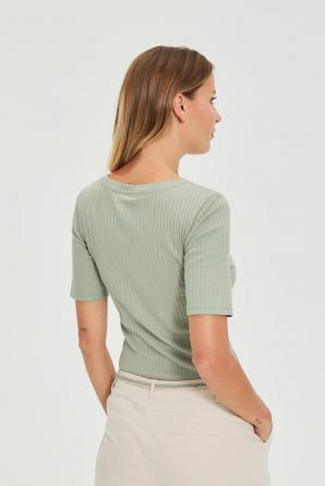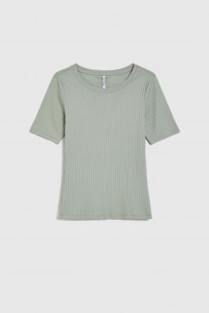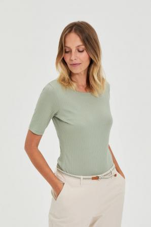 95% BAVLNA, 5% ELASTAN Tato žebrovaná halenka v olivově zelené barvě zaujme svou jednoduchostí a decentní elegancí. Přiléhavý střih krásně zdůrazňuje siluetu, zatímco krátké rukávy a kulatý výstřih dodávají nádech lehkosti a ženskosti. Měkká tkanina s přídavkem přírodních vláken zajišťuje celodenní pohodlí a vytváří všestranný základ pro různé outfity. Hladký, nevzorovaný povrch dělá z této halenky všestranný základní kousek šatníku, který snadno doplní moderní městský styl. Je ideální jak do kanceláře, tak pro každodenní výlety či schůzky s přáteli. Vypadá krásně v kombinaci s klasickými džínami, elegantní sukní nebo pod sakem a vytváří stylový look pro každou příležitost. Tato olivově zelená halenka s krátkým rukávem v sobě spojuje pohodlí, ženské kouzlo a módní minimalismus a inspiruje k vytváření jedinečných každodenních outfitů.